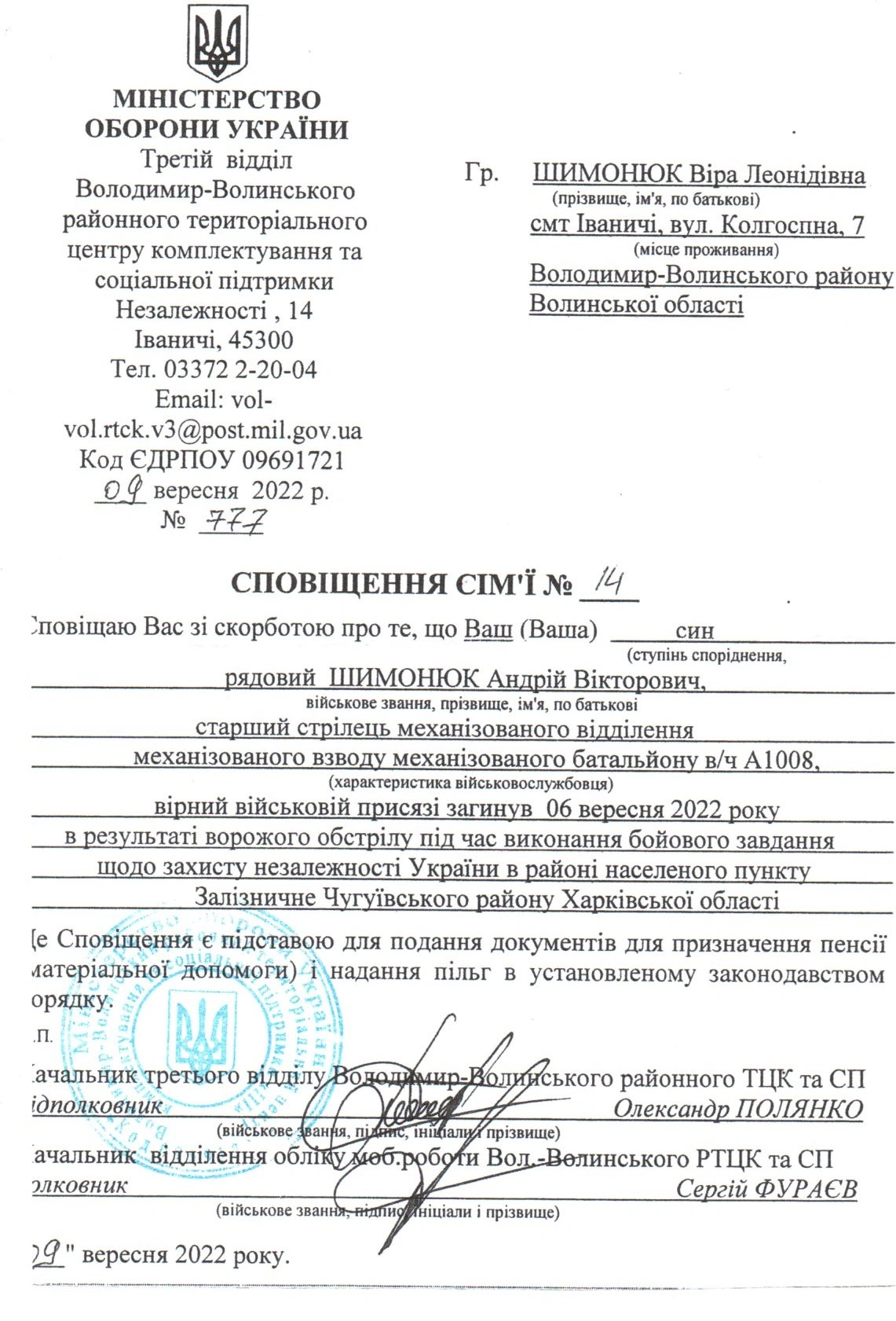 Рядовий Шимонюк Андрій Вікторович, старший стрілець механізованого відділення механізованого взводу механізованого батальйону вірний військовій присязі загинув 6 вересня 2022 року в результаті ворожого обстрілу під час виконання бойового завдання щодо захисту незалежності України в районі населеного пункту Залізничне Чугуївського району Харківської області.