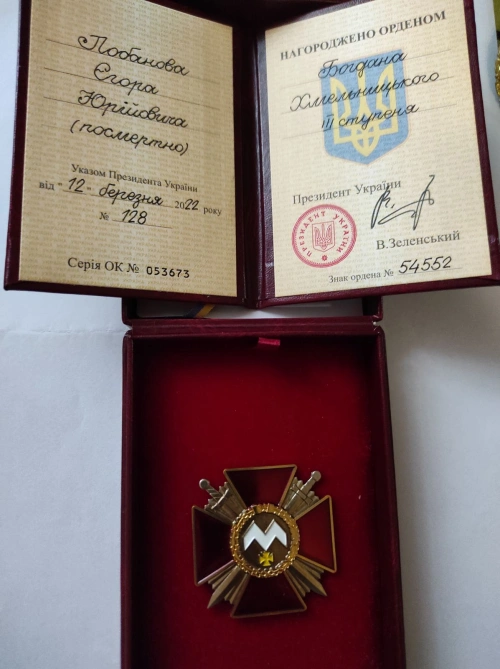 За особисту мужність і самовіддані дії, виявлені у захисті державного суверенітету та територіальної цілісності України, вірність військовій присязі старшого лейтенанта Лобанова Єгора Юрійовича нагороджено (посмертно) орденом Богдана Хмельницького ІІІ ступеня (указ Президента України від 12 березня 2022 року №128/2022 «Про відзначення державними нагородами України»).