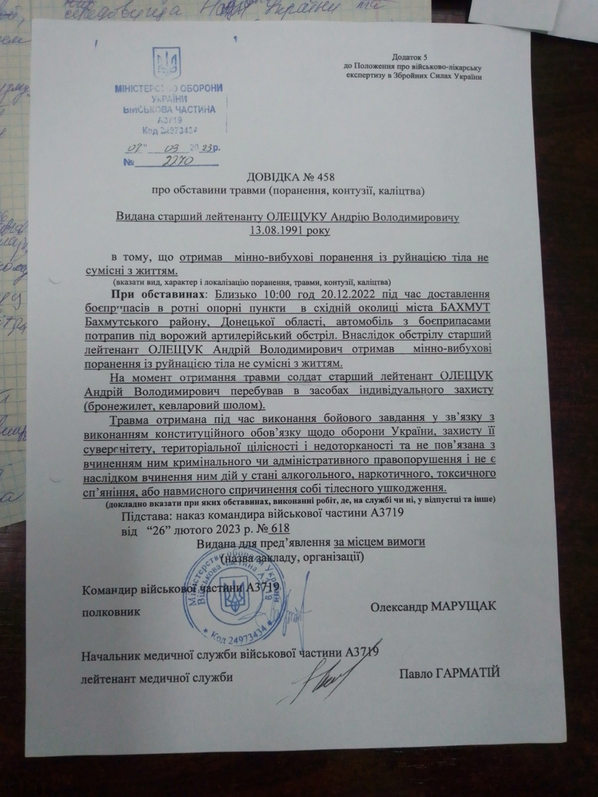 Вранці 20 грудня 2022 року група з трьох чоловік, очолювана старшим лейтенантом Андрієм Олещуком, під час виконання завдання із підвезення боєприпасів на позиції ротних опорних пунктів, що знаходились на східних околицях міста Бахмут, потрапила в автомобілі з боєкомплектом під ворожий обстріл на дамбі через річку Бахмутка [6]. Військовослужбовці за наказом командира вистрибнули з машини. Після влучання ворожої міни в транспортний засіб боєкомплект здетонував. Невдовзі через дамбу мчав автомобіль медичної служби, який підібрав двох важкопоранених бійців. Андрія середних не було.