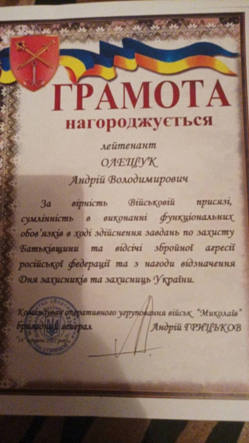 Лейтенант Олещук Андрій Володимирович 14 жовтня 2022 року за вірність Військовій присязі, сумлінність у виконанні функціональних обов’язків у ході здійснення завдань по захисту Батьківщини та відсічі збройної агресії російської федерації та з нагоди відзначення Дня захисників та захисниць України був нагороджений Грамотою за підписом командувача оперативного угруповання військ «Миколаїв» бригадного генерала Андрія Грицькова .