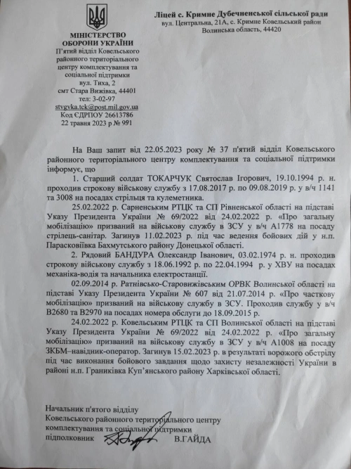 Вірні сини і дочки відгукнулися на твій клич, Україно! Одягли балаклави та бронежилети, взяли у руки автомати і рушили боронити рідні простори від підступного ворога. Серед них був і Святослав Токарчук, вродливий, статний красень, що народився 19 жовтня 1994 року в селі Кримне, Волинської області. Народження сина стало святом для Ольги Василівни та Ігоря Антоновича, адже вони давно мріяли про продовжувача роду. Радості батьків не було меж, коли Святко зробив перший крок, вимовив перше слово, пішов у перший клас....