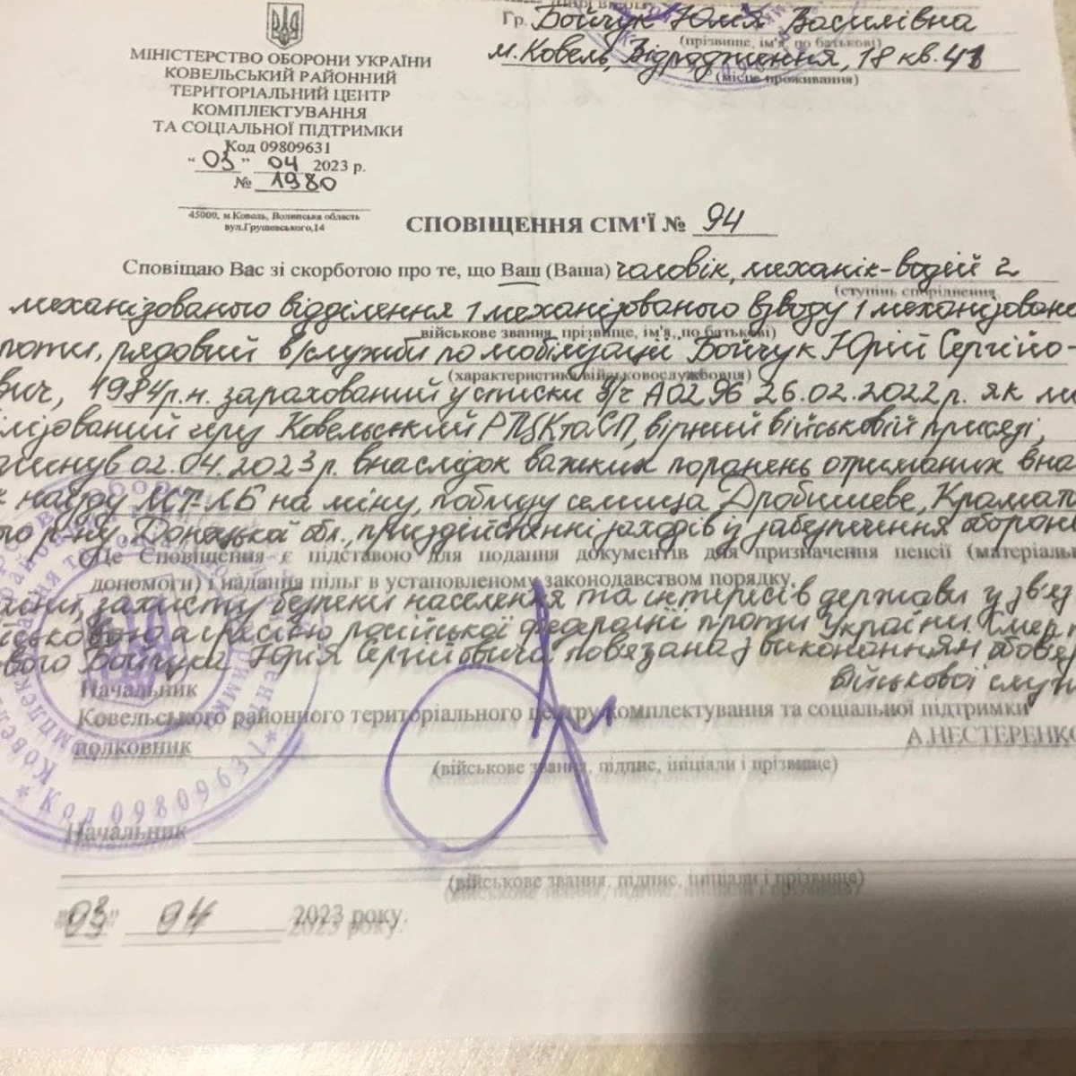 Юрій Сергійович Бойчук був мобілізований ще 26 лютого 2022 року. Воював на Херсонщині, в Миколаївській, Донецькій та Харківській областях, був механіком-водієм. А 2 квітня 2023 року загинув поблизу селища Дробишеве Краматорського району Донецької області. Він отримав важкі, несумісні з життям, поранення, коли броньований транспортер, в якому був Юрій, наїхав на міну [1 , 2, 3].
