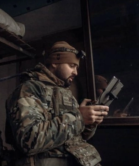 «Я не військовий фотограф чи журналіст, я, по факту, звичайний військовий, який інколи дістає фотоапарат із кишені. Перш за все, в руках я тримаю зброю, і лише, коли дозволяють умови та ситуація, дістаю фотоапарат.У цивільному житті, будучи весільним фотографом, який вдень танцює з нареченими, а вночі ретушує фото, я ніколи не тішив себе ілюзіями, що війна, яка тривала на Сході, не торкнеться усієї країни. Саме тому, в 20-их числах лютого, коли я замовив собі плитоноску, мої колеги відверто не розуміли це і радили купити щось до фотоапарата. Але уже тоді я знав, що точно не буду в рядах тих, хто стоїть у черзі на виїзд за кордон».